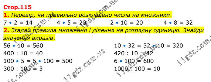 1. Перевір, чи правильно розкладено числа на множники. 7 • 2 = 14 4 • 5 = 20 2 • 10 = 20 4 • 8 = 32 2. Згадай правила множення і ділення на розрядну одиницю. Знайди значення виразів. 56 • 10 = 560 400 : 10 = 40 100 • 5 = 5 • 100 = 500 300 : 100 = 3 10 • 32 = 32 • 10 = 320 420 : 10 = 42 6 • 100 = 600 1000 : 100 = 10