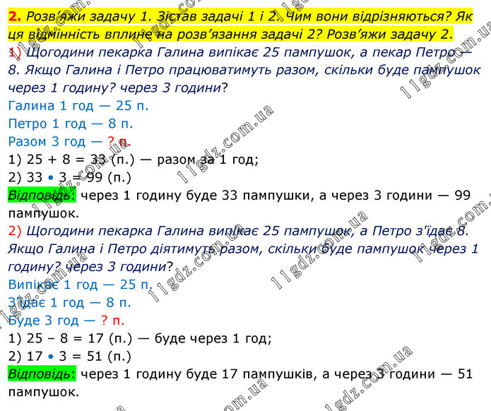 Розв’яжи задачу 1. Зістав задачі 1 і 2. Чим вони відрізняються? Як ця відмінність вплине на розв’язання задачі 2? Розв’яжи задачу 2. 1) Щогодини пекарка Галина випікає 25 пам¬пушок, а пекар Петро — 8. Якщо Галина і Петро працюватимуть разом, скільки буде пампушок через 1 годину? через 3 години? Галина 1 год — 25 п. Петро 1 год — 8 п. Разом 3 год — ? п. 1) 25 + 8 = 33 (п.) — разом за 1 год; 2) 33 • 3 = 99 (п.) Відповідь: через 1 годину буде 33 пампушки, а через 3 години — 99 пампушок. 2) Щогодини пекарка Галина випікає 25 пампушок, а Петро з'їдає 8. Якщо Галина і Петро діятимуть разом, скільки буде пампушок через 1 годину? через 3 години? Випікає 1 год — 25 п. З'їдає 1 год — 8 п. Буде 3 год — ? п. 1) 25 – 8 = 17 (п.) — буде через 1 год; 2) 17 • 3 = 51 (п.) Відповідь: через 1 годину буде 17 пампушків, а через 3 години — 51 пампушок.