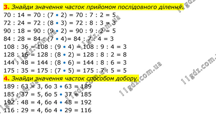3. Знайди значення часток прийомом послідовного ділення. 70 : 14 = 70 : (7 • 2) = 70 : 7 : 2 = 5 72 : 24 = 72 : (8 • 3) = 72 : 8 : 3 = 3 90 : 18 = 90 : (9 • 2) = 90 : 9 : 2 = 5 84 : 28 = 84 : (7 • 4)= 84 : 7 : 4 = 3 108 : 36 = 108 : (9 • 4) = 108 : 9 : 4 = 3 128 : 16 = 128 : (8 • 2) = 128 : 8 : 2 = 8 144 : 48 = 144 : (8 • 6) = 144 : 8 : 6 = 3 175 : 35 = 175 : (7 • 5) = 175 : 7 : 5 = 5 4. Знайди значення часток способом добору. 189 : 63 = 3, бо 3 • 63 = 189 185 : 37 = 5, бо 5 • 37 = 185 192 : 48 = 4, бо 4 • 48 = 192 116 : 29 = 4, бо 4 • 29 = 116