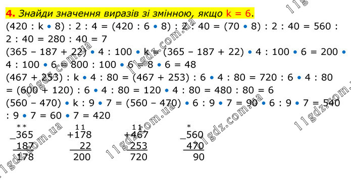 Знайди значення виразів зі змінною, якщо k = 6. (420 : k • 8) : 2 : 4 = (420 : 6 • 8) : 2 : 40 = (70 • 8) : 2 : 40 = 560 : 2 : 40 = 280 : 40 = 7 (365 – 187 + 22) • 4 : 100 • k = (365 – 187 + 22) • 4 : 100 • 6 = 200 • 4 : 100 • 6 = 800 : 100 • 6 = 8 • 6 = 48 (467 + 253) : k • 4 : 80 = (467 + 253) : 6 • 4 : 80 = 720 : 6 • 4 : 80 = (600 + 120) : 6 • 4 : 80 = 120 • 4 : 80 = 480 : 80 = 6 (560 – 470) • k : 9 • 7 = (560 – 470) • 6 : 9 • 7 = 90 • 6 : 9 • 7 = 540 : 9 • 7 = 60 • 7 = 420