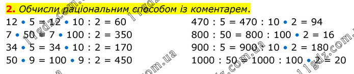 Обчисли раціональним способом із коментарем. 12 • 5 = 12 • 10 : 2 = 60 7 • 50 = 7 • 100 : 2 = 350 34 • 5 = 34 • 10 : 2 = 170 50 • 9 = 100 • 9 : 2 = 450 470 : 5 = 470 : 10 • 2 = 94 800 : 50 = 800 : 100 • 2 = 16 900 : 5 = 900 : 10 • 2 = 180 1000 : 50 = 1000 : 100 • 2 = 20