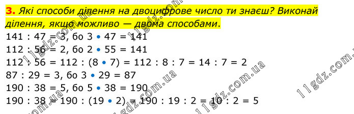 Які способи ділення на двоцифрове число ти знаєш? Виконай ділення, якщо можливо — двома способами. 141 : 47 = 3, бо 3 • 47 = 141 112 : 56 = 2, бо 2 • 55 = 141 112 : 56 = 112 : (8 • 7) = 112 : 8 : 7 = 14 : 7 = 2 87 : 29 = 3, бо 3 • 29 = 87 190 : 38 = 5, бо 5 • 38 = 190 190 : 38 = 190 : (19 • 2) = 190 : 19 : 2 = 10 : 2 = 5