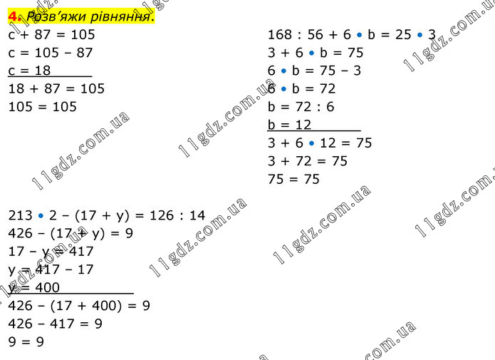 Розв’яжи рівняння. с + 87 = 105 с = 105 – 87 с = 18_____ 18 + 87 = 105 105 = 105 168 : 56 + 6 • b = 25 • 3 3 + 6 • b = 75 6 • b = 75 – 3 6 • b = 72 b = 72 : 6 b = 12______ 3 + 6 • 12 = 75 3 + 72 = 75 75 = 75 213 • 2 – (17 + у) = 126 : 14 426 – (17 + у) = 9 17 – у = 417 у = 417 – 17 у = 400_________ 426 – (17 + 400) = 9 426 – 417 = 9 9 = 9