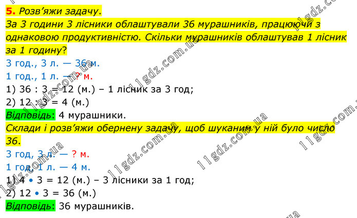 Розв’яжи задачу. За 3 години 3 лісники облаштували 36 му¬рашників, працюючи з однаковою продук¬тивністю. Скільки мурашників облаштував 1 лісник за 1 годину? 3 год., 3 л. — 36 м. 1 год., 1 л. — ? м. 1) 36 : 3 = 12 (м.) – 1 лісник за 3 год; 2) 12 : 3 = 4 (м.) Відповідь: 4 мурашники. Склади і розв’яжи обернену задачу, щоб шуканим у ній було число 36. 3 год, 3 л. — ? м. 1 год, 1 л. — 4 м. 1) 4 • 3 = 12 (м.) – 3 лісники за 1 год; 2) 12 • 3 = 36 (м.) Відповідь: 36 мурашників.