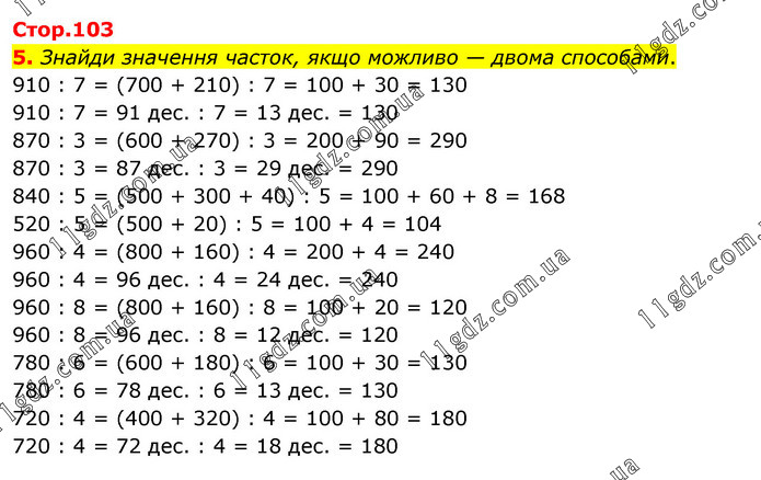 Знайди значення часток, якщо можливо — двома способами. 910 : 7 = (700 + 210) : 7 = 100 + 30 = 130 910 : 7 = 91 дес. : 7 = 13 дес. = 130 870 : 3 = (600 + 270) : 3 = 200 + 90 = 290 870 : 3 = 87 дес. : 3 = 29 дес. = 290 840 : 5 = (500 + 300 + 40) : 5 = 100 + 60 + 8 = 168 520 : 5 = (500 + 20) : 5 = 100 + 4 = 104 960 : 4 = (800 + 160) : 4 = 200 + 4 = 240 960 : 4 = 96 дес. : 4 = 24 дес. = 240 960 : 8 = (800 + 160) : 8 = 100 + 20 = 120 960 : 8 = 96 дес. : 8 = 12 дес. = 120 780 : 6 = (600 + 180) : 6 = 100 + 30 = 130 780 : 6 = 78 дес. : 6 = 13 дес. = 130 720 : 4 = (400 + 320) : 4 = 100 + 80 = 180 720 : 4 = 72 дес. : 4 = 18 дес. = 180