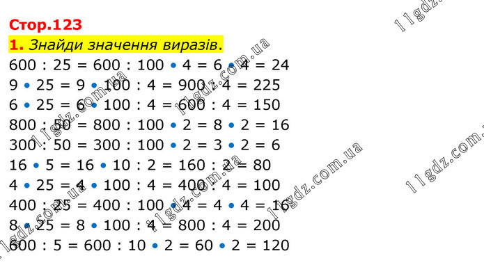 Знайди значення виразів. 600 : 25 = 600 : 100 • 4 = 6 • 4 = 24 9 • 25 = 9 • 100 : 4 = 900 : 4 = 225 6 • 25 = 6 • 100 : 4 = 600 : 4 = 150 800 : 50 = 800 : 100 • 2 = 8 • 2 = 16 300 : 50 = 300 : 100 • 2 = 3 • 2 = 6 16 • 5 = 16 • 10 : 2 = 160 : 2 = 80 4 • 25 = 4 • 100 : 4 = 400 : 4 = 100 400 : 25 = 400 : 100 • 4 = 4 • 4 = 16 8 • 25 = 8 • 100 : 4 = 800 : 4 = 200 600 : 5 = 600 : 10 • 2 = 60 • 2 = 120