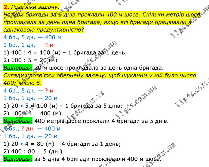 Розв’яжи задачу. Чотири бригади за 5 днів проклали 400 м шосе. Скільки метрів шосе про¬кладала за день одна бригада, якщо всі бригади працювали з однаковою продуктивністю? 4 бр., 5 дн. — 400 м 1 бр., 1 дн. — ? м 1) 400 : 4 = 100 (м) – 1 бригада за 1 день; 2) 100 : 5 = 20 (м) Відповідь: 20 м шосе прокладала за день одна бригада. Склади і розв’яжи обернену задачу, щоб шуканим у ній було число 400; число 5. 4 бр., 5 дн. — ? м 1 бр., 1 дн. — 20 м 1) 20 • 5 = 100 (м) – 1 бригада за 5 днів; 2) 100 • 4 = 400 (м) Відповідь: 400 метрів шосе проклали 4 бригади за 5 днів. 4 бр., ? дн. — 400 м 1 бр., 1 дн. — 20 м 1) 20 • 4 = 80 (м) – 4 бригади за 1 день; 2) 400 : 80 = 5 (дн.) Відповідь: за 5 днів 4 бригади прокладали 400 м шосе.