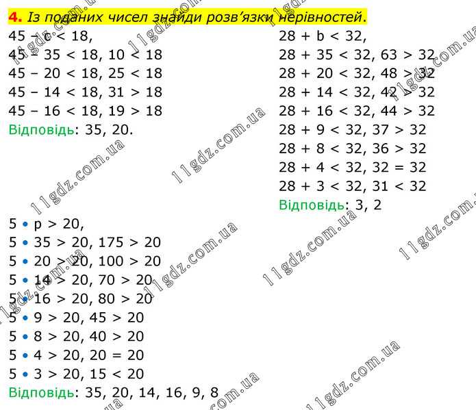 Із поданих чисел знайди розв’язки нерівностей. 45 – с < 18, 45 – 35 < 18, 10 < 18 45 – 20 < 18, 25 < 18 45 – 14 < 18, 31 > 18 45 – 16 < 18, 19 > 18 Відповідь: 35, 20. 28 + b < 32, 28 + 35 < 32, 63 > 32 28 + 20 < 32, 48 > 32 28 + 14 < 32, 42 > 32 28 + 16 < 32, 44 > 32 28 + 9 < 32, 37 > 32 28 + 8 < 32, 36 > 32 28 + 4 < 32, 32 = 32 28 + 3 < 32, 31 < 32 Відповідь: 3, 2 5 • p > 20, 5 • 35 > 20, 175 > 20 5 • 20 > 20, 100 > 20 5 • 14 > 20, 70 > 20 5 • 16 > 20, 80 > 20 5 • 9 > 20, 45 > 20 5 • 8 > 20, 40 > 20 5 • 4 > 20, 20 = 20 5 • 3 > 20, 15 < 20 Відповідь: 35, 20, 14, 16, 9, 8