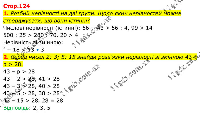 1. Розбий нерівності на дві групи. Щодо яких нерівностей можна стверджувати, що вони істинні? Числові нерівності (істинні): 56 + 43 > 56 : 4, 99 > 14 500 : 25 > 280 : 70, 20 > 4 Нерівність зі змінною: f + 18 < 13 • 3 2. Серед чисел 2; 3; 5; 15 знайди розв’язки нерівності зі змінною 43 – р > 28. 43 – р > 28 43 – 2 > 28, 41 > 28 43 – 3 > 28, 40 > 28 43 – 5 > 28, 38 > 28 43 – 15 > 28, 28 = 28 Відповідь: 2, 3, 5