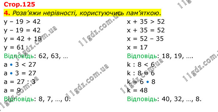 Розв’яжи нерівності, користуючись пам’яткою. у – 19 > 42 у – 19 = 42 у = 42 + 19 у = 61 Відповідь: 62, 63, … а • 3 < 27 а • 3 = 27 а = 27 : 3 а = 9 Відповідь: 8, 7, …, 0. х + 35 > 52 х + 35 = 52 х = 52 – 35 х = 17 Відповідь: 18, 19, …. k : 8 < 6 k : 8 = 6 k = 6 • 8 k = 48 Відповідь: 40, 32, …, 8.