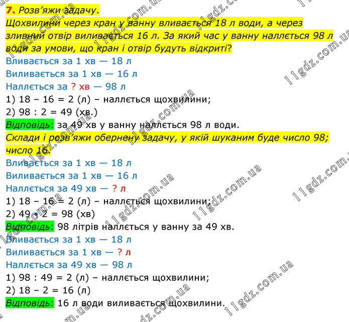 Розв’яжи задачу. Щохвилини через кран у ванну вливається 18 л води, а через зливний отвір виливається 16 л. За який час у ванну наллється 98 л води за умови, що кран і отвір будуть відкриті? Вливається за 1 хв — 18 л Виливається за 1 хв — 16 л Наллється за ? хв — 98 л 1) 18 – 16 = 2 (л) – наллється щохвилини; 2) 98 : 2 = 49 (хв.) Відповідь: за 49 хв у ванну наллється 98 л води. Склади і розв’яжи обернену задачу, у якій шуканим буде число 98; число 16. Вливається за 1 хв — 18 л Виливається за 1 хв — 16 л Наллється за 49 хв — ? л 1) 18 – 16 = 2 (л) – наллється щохвилини; 2) 49 • 2 = 98 (хв) Відповідь: 98 літрів наллється у ванну за 49 хв. Вливається за 1 хв — 18 л Виливається за 1 хв — ? л Наллється за 49 хв — 98 л 1) 98 : 49 = 2 (л) – наллється щохвилини; 2) 18 – 2 = 16 (л) Відповідь: 16 л води виливається щохвилини.