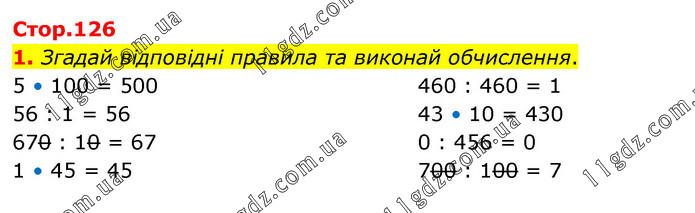 Згадай відповідні правила та виконай обчислення. 5 • 100 = 500 56 : 1 = 56 670 : 10 = 67 1 • 45 = 45 460 : 460 = 1 43 • 10 = 430 0 : 456 = 0 700 : 100 = 7