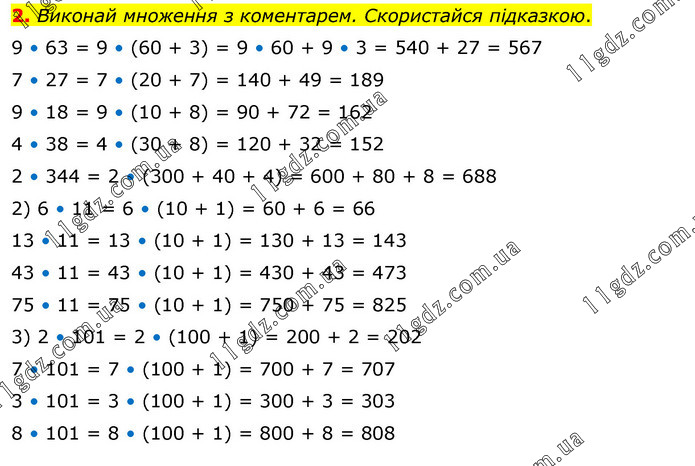 Виконай множення з коментарем. Скористайся підказкою. 9 • 63 = 9 • (60 + 3) = 9 • 60 + 9 • 3 = 540 + 27 = 567 7 • 27 = 7 • (20 + 7) = 140 + 49 = 189 9 • 18 = 9 • (10 + 8) = 90 + 72 = 162 4 • 38 = 4 • (30 + 8) = 120 + 32 = 152 2 • 344 = 2 • (300 + 40 + 4) = 600 + 80 + 8 = 688 2) 6 • 11 = 6 • (10 + 1) = 60 + 6 = 66 13 • 11 = 13 • (10 + 1) = 130 + 13 = 143 43 • 11 = 43 • (10 + 1) = 430 + 43 = 473 75 • 11 = 75 • (10 + 1) = 750 + 75 = 825 3) 2 • 101 = 2 • (100 + 1) = 200 + 2 = 202 7 • 101 = 7 • (100 + 1) = 700 + 7 = 707 3 • 101 = 3 • (100 + 1) = 300 + 3 = 303 8 • 101 = 8 • (100 + 1) = 800 + 8 = 808