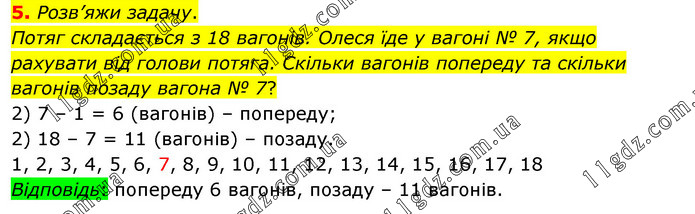 Розв’яжи задачу. Потяг складається з 18 вагонів. Олеся їде у вагоні № 7, якщо рахувати від голови потяга. Скільки вагонів попереду та скіль¬ки вагонів позаду вагона № 7? 2) 7 – 1 = 6 (вагонів) – попереду; 2) 18 – 7 = 11 (вагонів) – позаду. 1, 2, 3, 4, 5, 6, 7, 8, 9, 10, 11, 12, 13, 14, 15, 16, 17, 18 Відповідь: попереду 6 вагонів, позаду – 11 вагонів.