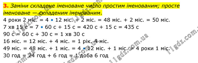 Заміни складене іменоване число простим іменованим; просте іменоване — складеним іменованим. 4 роки 2 міс. = 4 • 12 міс. + 2 міс. = 48 міс. + 2 міс. = 50 міс. 7 хв 15 с = 7 • 60 с + 15 с = 420 с + 15 с = 435 с 90 с = 60 с + 30 с = 1 хв 30 с 16 міс. = 12 міс. + 4 міс. = 1 рік. 4 міс. 49 міс. = 48 міс. + 1 міс. = 4 • 12 міс. + 1 міс. = 4 роки 1 міс. 30 год = 24 год + 6 год = 1 доба 6 год