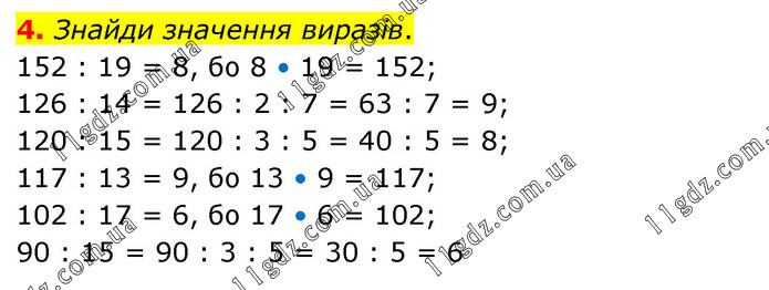 Знайди значення виразів. 152 : 19 = 8, бо 8 • 19 = 152; 126 : 14 = 126 : 2 : 7 = 63 : 7 = 9; 120 : 15 = 120 : 3 : 5 = 40 : 5 = 8; 117 : 13 = 9, бо 13 • 9 = 117; 102 : 17 = 6, бо 17 • 6 = 102; 90 : 15 = 90 : 3 : 5 = 30 : 5 = 6