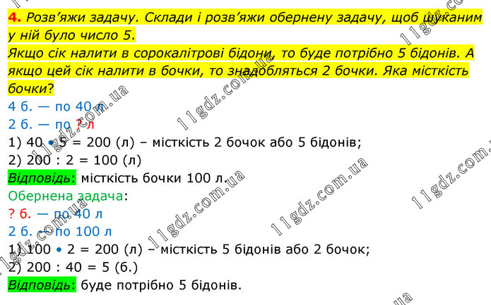Розв’яжи задачу. Склади і розв’яжи обернену задачу, щоб шуканим у ній було число 5. Якщо сік налити в сорокалітрові бідони, то буде потрібно 5 бідонів. А якщо цей сік налити в бочки, то знадобляться 2 бочки. Яка місткість бочки? 4 б. — по 40 л 2 б. — по ? л 1) 40 • 5 = 200 (л) – місткість 2 бочок або 5 бідонів; 2) 200 : 2 = 100 (л) Відповідь: місткість бочки 100 л. Обернена задача: ? б. — по 40 л 2 б. — по 100 л 1) 100 • 2 = 200 (л) – місткість 5 бідонів або 2 бочок; 2) 200 : 40 = 5 (б.) Відповідь: буде потрібно 5 бідонів.