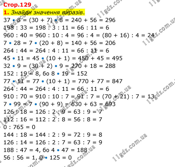 Знайди значення виразів. 37 • 8 = (30 + 7) • 8 = 240 + 56 = 296 198 : 33 = 198 : 3 : 11 = 66 : 11 = 6 960 : 40 = 960 : 10 : 4 = 96 : 4 = (80 + 16) : 4 = 24 7 • 28 = 7 • (20 + 8) = 140 + 56 = 206 264 : 44 = 264 : 4 : 11 = 66 : 11 = 6 45 • 11 = 45 • (10 + 1) = 450 + 45 = 495 32 • 9 = (30 + 2) • 9 = 270 + 18 = 288 152 : 19 = 8, бо 8 • 19 = 152 77 • 11 = 77 • (10 + 1) = 770 + 77 = 847 264 : 44 = 264 : 4 : 11 = 66 : 11 = 6 910 : 70 = 910 : 10 : 7 = 91 : 7 = (70 + 21) : 7 = 13 7 • 99 = 7 • (90 + 9) = 630 + 63 = 693 126 : 18 = 126 : 2 : 9 = 63 : 9 = 7 112 : 16 = 112 : 2 : 8 = 56 : 8 = 7 0 : 765 = 0 144 : 18 = 144 : 2 : 9 = 72 : 9 = 8 126 : 14 = 126 : 2 : 7 = 63 : 7 = 9 188 : 47 = 4, бо 4 • 47 = 188 56 : 56 = 1, 0 • 125 = 0