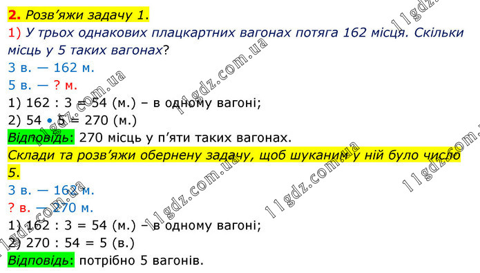Розв’яжи задачу 1. 1) У трьох однакових плацкартних вагонах потяга 162 місця. Скіль¬ки місць у 5 таких вагонах? 3 в. — 162 м. 5 в. — ? м. 1) 162 : 3 = 54 (м.) – в одному вагоні; 2) 54 • 5 = 270 (м.) Відповідь: 270 місць у п’яти таких вагонах. Склади та розв’яжи обернену задачу, щоб шуканим у ній було число 5. 3 в. — 162 м. ? в. — 270 м. 1) 162 : 3 = 54 (м.) – в одному вагоні; 2) 270 : 54 = 5 (в.) Відповідь: потрібно 5 вагонів.