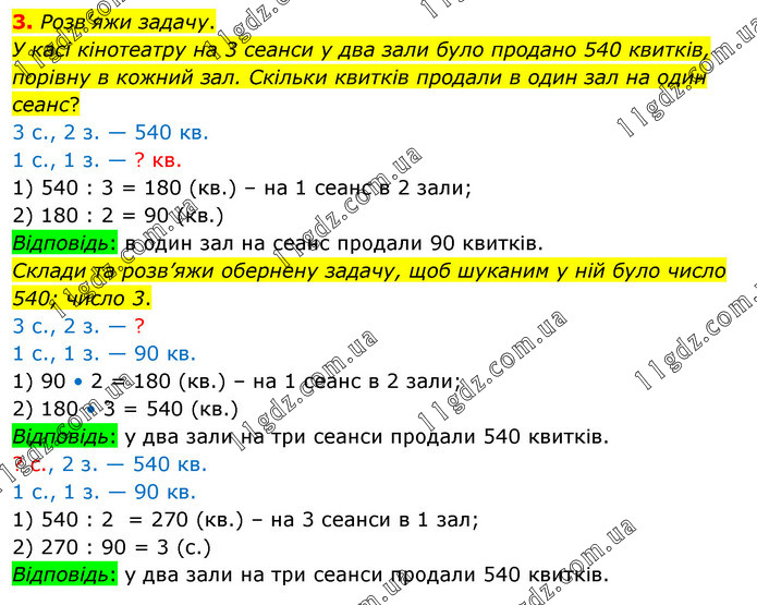 Розв’яжи задачу. У касі кінотеатру на 3 сеанси у два зали було продано 540 квитків, порівну в кожний зал. Скільки квитків продали в один зал на один сеанс? 3 с., 2 з. — 540 кв. 1 с., 1 з. — ? кв. 1) 540 : 3 = 180 (кв.) – на 1 сеанс в 2 зали; 2) 180 : 2 = 90 (кв.) Відповідь: в один зал на сеанс продали 90 квитків. Склади та розв’яжи обернену задачу, щоб шуканим у ній було число 540; число 3. 3 с., 2 з. — ? 1 с., 1 з. — 90 кв. 1) 90 • 2 = 180 (кв.) – на 1 сеанс в 2 зали; 2) 180 • 3 = 540 (кв.) Відповідь: у два зали на три сеанси продали 540 квитків. ? с., 2 з. — 540 кв. 1 с., 1 з. — 90 кв. 1) 540 : 2 = 270 (кв.) – на 3 сеанси в 1 зал; 2) 270 : 90 = 3 (с.) Відповідь: у два зали на три сеанси продали 540 квитків.