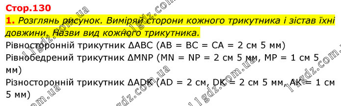 Розглянь рисунок. Виміряй сторони кожного трикутника і зістав їхні довжини. Назви вид кожного трикутника. Рівносторонній трикутник ΔАВС (АВ = ВС = СА = 2 см 5 мм) Рівнобедрений трикутник ΔMNP (MN = NP = 2 см 5 мм, МР = 1 см 5 мм) Різносторонній трикутник ΔADK (AD = 2 см, DK = 2 см 5 мм, АК = 1 см 5 мм)