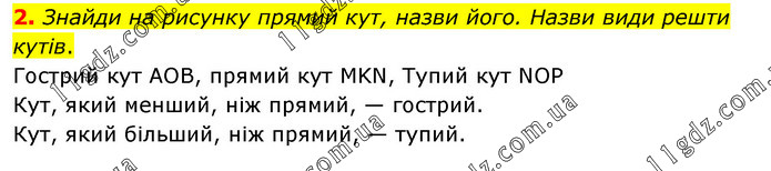 Знайди на рисунку прямий кут, назви його. Назви види решти кутів. Гострий кут АОВ, прямий кут MKN, Тупий кут NОP Кут, який менший, ніж прямий, — гострий. Кут, який більший, ніж прямий, — тупий.