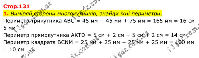 Виміряй сторони многокутників, знайди їхні периметри. Периметр трикутника АВС = 45 мм + 45 мм + 75 мм = 165 мм = 16 см 5 мм Периметр прямокутника AKTD = 5 см + 2 см + 5 см + 2 см = 14 см Периметр квадрата BCNM = 25 мм + 25 мм + 25 мм + 25 мм = 100 мм = 10 см