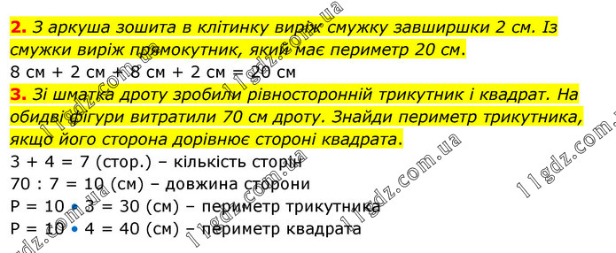 2. З аркуша зошита в клітинку виріж смужку завширшки 2 см. Із смужки виріж прямокутник, який має периметр 20 см. 8 см + 2 см + 8 см + 2 см = 20 см 3. Зі шматка дроту зробили рівносторонній трикутник і квадрат. На обидві фігури витратили 70 см дроту. Знайди периметр трикутника, якщо його сторона дорівнює стороні квадрата. 3 + 4 = 7 (стор.) – кількість сторін 70 : 7 = 10 (см) – довжина сторони Р = 10 • 3 = 30 (см) – периметр трикутника Р = 10 • 4 = 40 (см) – периметр квадрата