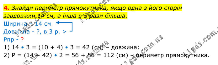 Знайди периметр прямокутника, якщо одна з його сторін завдовжки 14 см, а інша в 3 рази більша. Ширина – 14 см Довжина - ?, в 3 р. > Рпр - ? 1) 14 • 3 = (10 + 4) • 3 = 42 (см) – довжина; 2) Р = (14 + 42) • 2 = 56 + 56 = 112 (см) – периметр прямокутника.
