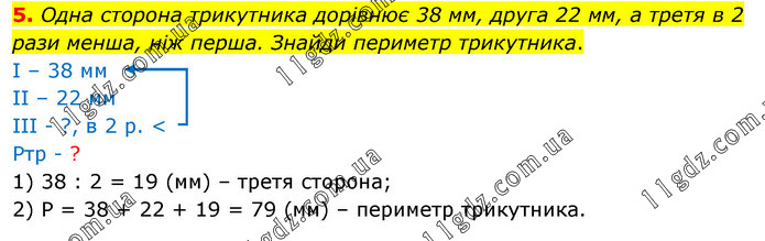 Одна сторона трикутника дорівнює 38 мм, друга 22 мм, а третя в 2 рази менша, ніж перша. Знайди периметр трикутника. І – 38 мм ІІ – 22 мм ІІІ - ?, в 2 р. < Ртр - ? 1) 38 : 2 = 19 (мм) – третя сторона; 2) Р = 38 + 22 + 19 = 79 (мм) – периметр трикутника.
