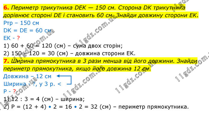 6. Периметр трикутника DEK — 150 см. Сторона DK трикутника дорівнює стороні DE і становить 60 см. Знайди довжину сторони EK. Ртр – 150 см DK = DE = 60 см ЕК - ? 1) 60 + 60 = 120 (см) – сума двох сторін; 2) 150 – 120 = 30 (см) – довжина сторони ЕК. 7. Ширина прямокутника в 3 рази менша від його довжини. Знайди периметр прямокутника, якщо його довжина 12 см. Довжина – 12 см Ширина - ?, у 3 р. < Р - ? 1) 12 : 3 = 4 (см) – ширина; 2) Р = (12 + 4) • 2 = 16 • 2 = 32 (см) – периметр прямокутника.