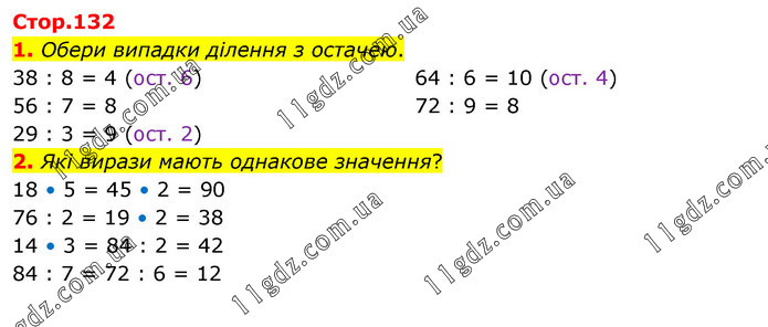 1. Обери випадки ділення з остачею. 38 : 8 = 4 (ост. 6) 56 : 7 = 8 29 : 3 = 9 (ост. 2) 64 : 6 = 10 (ост. 4) 72 : 9 = 8 2. Які вирази мають однакове значення? 18 • 5 = 45 • 2 = 90 76 : 2 = 19 • 2 = 38 14 • 3 = 84 : 2 = 42 84 : 7 = 72 : 6 = 12