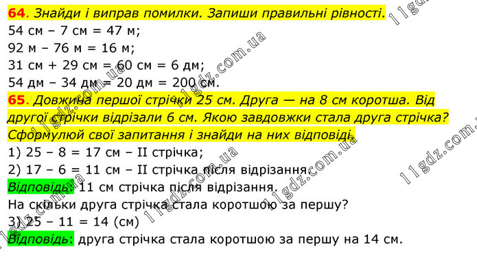 64. Знайди і виправ помилки. Запиши правильні рівності. 54 см – 7 см = 47 м; 92 м – 76 м = 16 м; 31 см + 29 см = 60 см = 6 дм; 54 дм – 34 дм = 20 дм = 200 см. 65. Довжина першої стрічки 25 см. Друга — на 8 см коротша. Від другої стрічки відрізали 6 см. Якою завдовжки стала друга стрічка? Сформулюй свої запитання і знайди на них відповіді. 1) 25 – 8 = 17 см – ІІ стрічка; 2) 17 – 6 = 11 см – ІІ стрічка після відрізання. Відповідь: 11 см стрічка після відрізання. На скільки друга стрічка стала коротшою за першу? 3) 25 – 11 = 14 (см) Відповідь: друга стрічка стала коротшою за першу на 14 см.