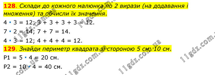 128. Склади до кожного малюнка по 2 вирази (на додавання і множення) та обчисли їх значення. 4 ∙ 3 = 12; 3 + 3 + 3 + 3 = 12. 7 ∙ 2 = 14; 7 + 7 = 14. 4 ∙ 3 = 12; 4 + 4 + 4 = 12. 129. Знайди периметр квадрата зі стороною 5 см; 10 см. Р1 = 5 ∙ 4 = 20 см. Р2 = 10 ∙ 4 = 40 см.