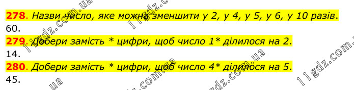 278. Назви число, яке можна зменшити у 2, у 4, у 5, у 6, у 10 разів. 60. 279. Добери замість * цифри, щоб число 1* ділилося на 2. 14. 280. Добери замість * цифри, щоб число 4* ділилося на 5. 45.