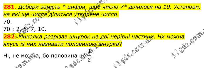 281. Добери замість * цифри, щоб число 7* ділилося на 10. Установи, на які ще числа ділиться утворене число. 70. 70 : 2, 5, 7, 10. 282. Миколка розрізав шнурок на дві нерівні частини. Чи можна якусь із них називати половиною шнурка? Ні, не можна, бо половина це 1/2.