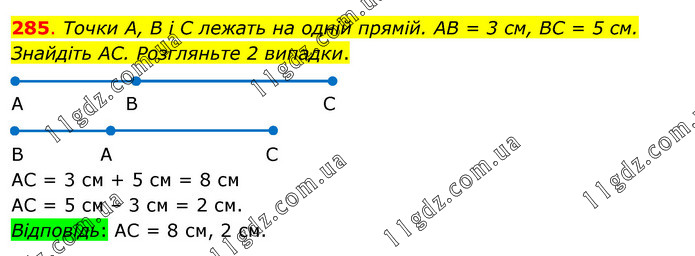 Точки А, В і С лежать на одній прямій. АВ = 3 см, ВС = 5 см. Знайдіть АС. Розгляньте 2 випадки. АС = 3 см + 5 см = 8 см АС = 5 см – 3 см = 2 см. Відповідь: АС = 8 см, 2 см.