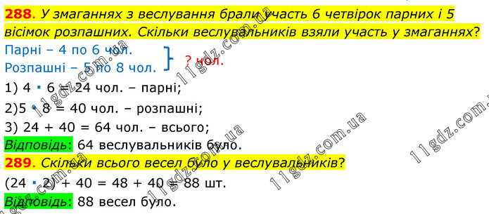 288. У змаганнях з веслування брали участь 6 четвірок парних і 5 вісімок розпашних. Скільки веслувальників взяли участь у змаганнях? Парні – 4 по 6 чол. Розпашні – 5 по 8 чол. 1) 4 ∙ 6 = 24 чол. – парні; 2)5 ∙ 8 = 40 чол. – розпашні; 3) 24 + 40 = 64 чол. – всього; Відповідь: 64 веслувальників було. 289. Скільки всього весел було у веслувальників? (24 ∙ 2) + 40 = 48 + 40 = 88 шт. Відповідь: 88 весел було.