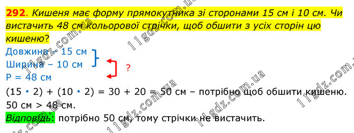 Кишеня має форму прямокутника зі сторонами 15 см і 10 см. Чи вистачить 48 см кольорової стрічки, щоб обшити з усіх сторін цю кишеню? Довжина – 15 см Ширина – 10 см Р = 48 см (15 ∙ 2) + (10 ∙ 2) = 30 + 20 = 50 см – потрібно щоб обшити кишеню. 50 см > 48 см. Відповідь: потрібно 50 см, тому стрічки не вистачить.