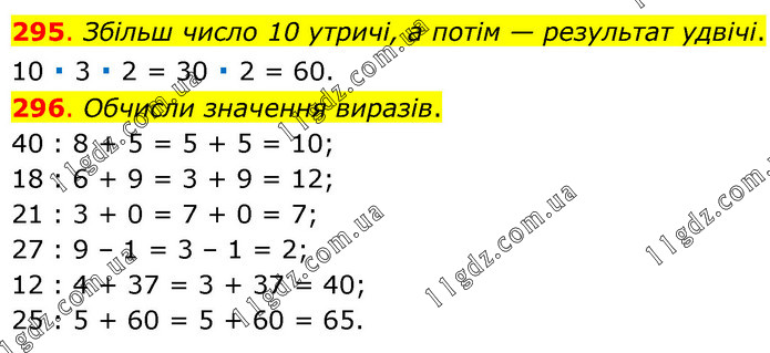 295. Збільш число 10 утричі, а потім — результат удвічі. 10 ∙ 3 ∙ 2 = 30 ∙ 2 = 60. 296. Обчисли значення виразів. 40 : 8 + 5 = 5 + 5 = 10; 18 : 6 + 9 = 3 + 9 = 12; 21 : 3 + 0 = 7 + 0 = 7; 27 : 9 – 1 = 3 – 1 = 2; 12 : 4 + 37 = 3 + 37 = 40; 25 : 5 + 60 = 5 + 60 = 65.