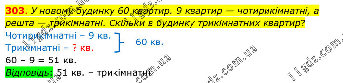 У новому будинку 60 квартир. 9 квартир — чотирикімнатні, а решта — трикімнатні. Скільки в будинку трикімнатних квартир? Чотирикімнатні – 9 кв. Трикімнатні – ? кв. 60 – 9 = 51 кв. Відповідь: 51 кв. – трикімнатні.