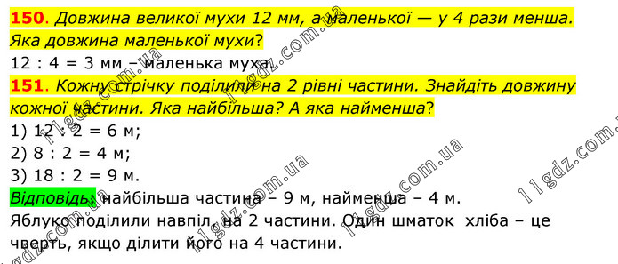 150. Довжина великої мухи 12 мм, а маленької — у 4 рази менша. Яка довжина маленької мухи? 12 : 4 = 3 мм – маленька муха. 151. Кожну стрічку поділили на 2 рівні частини. Знайдіть довжину кожної частини. Яка найбільша? А яка найменша? 1) 12 : 2 = 6 м; 2) 8 : 2 = 4 м; 3) 18 : 2 = 9 м. Відповідь: найбільша частина – 9 м, найменша – 4 м. Яблуко поділили навпіл, на 2 частини. Один шматок хліба – це чверть, якщо ділити його на 4 частини.