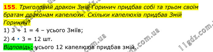 Триголовий дракон Змій Горинич придбав собі та трьом своїм братам драконам капелюхи. Скільки капелюхів придбав Змій Горинич? 1) 3 + 1 = 4 – усього Зміїв; 2) 4 ∙ 3 = 12 шт. Відповідь: усього 12 капелюхів придбав змій.