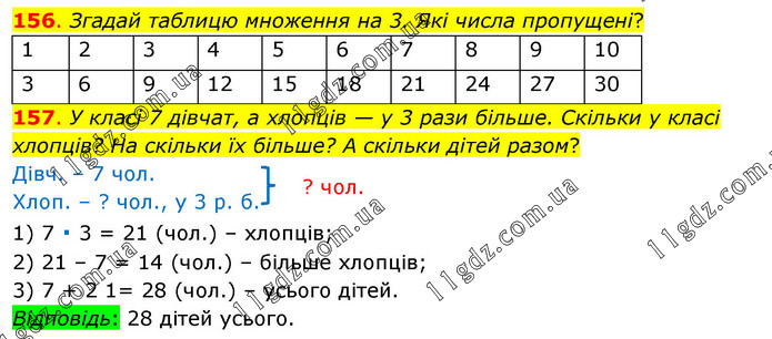 157. У класі 7 дівчат, а хлопців — у 3 рази більше. Скільки у класі хлопців? На скільки їх більше? А скільки дітей разом? Дівч. – 7 чол. Хлоп. – ? чол., у 3 р. б. 1) 7 ∙ 3 = 21 (чол.) – хлопців; 2) 21 – 7 = 14 (чол.) – більше хлопців; 3) 7 + 2 1= 28 (чол.) – усього дітей. Відповідь: 28 дітей усього.