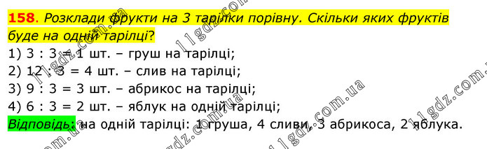 Розклади фрукти на 3 тарілки порівну. Скільки яких фруктів буде на одній тарілці? 1) 3 : 3 = 1 шт. – груш на тарілці; 2) 12 : 3 = 4 шт. – слив на тарілці; 3) 9 : 3 = 3 шт. – абрикос на тарілці; 4) 6 : 3 = 2 шт. – яблук на одній тарілці; Відповідь: на одній тарілці: 1 груша, 4 сливи, 3 абрикоса, 2 яблука.