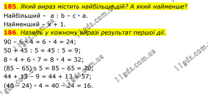 185. Який вираз містить найбільше дій? А який найменше? Найбільший – а : b – c ∙ а. Найменший – х + 1. 186. Назвіть у кожному виразі результат першої дії. 90 – 6 ∙ 4 = 6 ∙ 4 = 24; 50 + 45 : 5 = 45 : 5 = 9; 8 ∙ 4 + 6 ∙ 7 = 8 ∙ 4 = 32; (85 – 65) : 5 = 85 – 65 = 20; 44 + 13 – 9 = 44 + 13 = 57; (40 – 24) ∙ 4 = 40 – 24 = 16.
