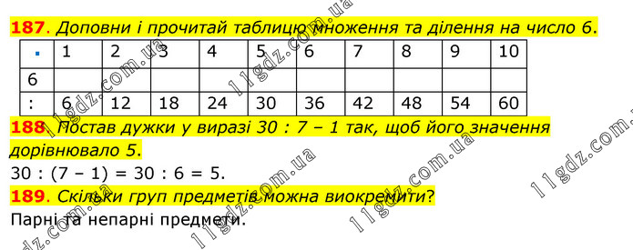 188. Постав дужки у виразі 30 : 7 – 1 так, щоб його значення дорівнювало 5. 30 : (7 – 1) = 30 : 6 = 5. 189. Скільки груп предметів можна виокремити? Парні та непарні предмети.