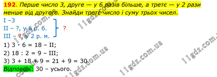 Перше число 3, друге — у 6 разів більше, а третє — у 2 рази менше від другого. Знайди третє число і суму трьох чисел. І –3 ІІ – ?, у 6 р. б. ? ІІІ – ?, у 2 р. м. 1) 3 ∙ 6 = 18 – ІІ; 2) 18 : 2 = 9 – ІІІ; 3) 3 + 18 + 9 = 21 + 9 = 30. Відповідь: 30 – усього.