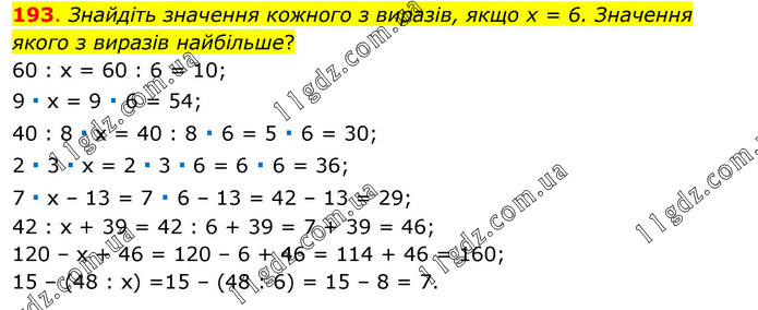 Знайдіть значення кожного з виразів, якщо х = 6. Значення якого з виразів найбільше? 60 : х = 60 : 6 = 10; 9 ∙ х = 9 ∙ 6 = 54; 40 : 8 ∙ х = 40 : 8 ∙ 6 = 5 ∙ 6 = 30; 2 ∙ 3 ∙ х = 2 ∙ 3 ∙ 6 = 6 ∙ 6 = 36; 7 ∙ х – 13 = 7 ∙ 6 – 13 = 42 – 13 = 29; 42 : х + 39 = 42 : 6 + 39 = 7 + 39 = 46; 120 – х + 46 = 120 – 6 + 46 = 114 + 46 = 160; 15 – (48 : х) =15 – (48 : 6) = 15 – 8 = 7.