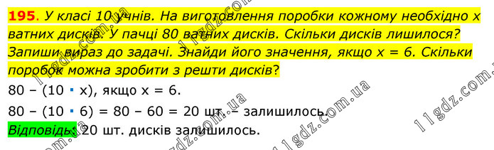 У класі 10 учнів. На виготовлення поробки кожному необхідно х ватних дисків. У пачці 80 ватних дисків. Скільки дисків лишилося? Запиши вираз до задачі. Знайди його значення, якщо х = 6. Скільки поробок можна зробити з решти дисків? 80 – (10 ∙ х), якщо х = 6. 80 – (10 ∙ 6) = 80 – 60 = 20 шт. – залишилось. Відповідь: 20 шт. дисків залишилось.